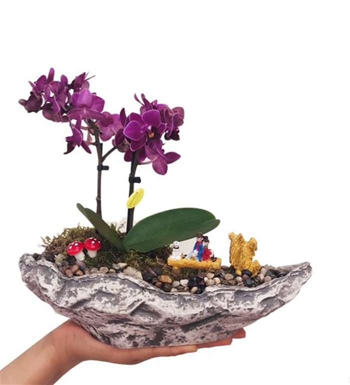 Dekoratif saksı içerisine yerleştirilen âşık bir çiftin biblosu ve mini orkide bulunan aranjmanın yüksekliği 20 cm, saksı ölçüleri ise yükseklik 8cm X genişlik 30 cm şeklindedir. Kullanılan bitkinin renkleri mevsimsel koşullara ve stok durumuna göre değişiklik gösterebilir ve bakımı konusunda endişelenmeye gerek yoktur. Nem dengesini korumak için haftada bir iki kez yapraklarına su püskürtmek ve direk güneş ışığı olmayan aydınlık bir mekânda bakmak kâfidir.